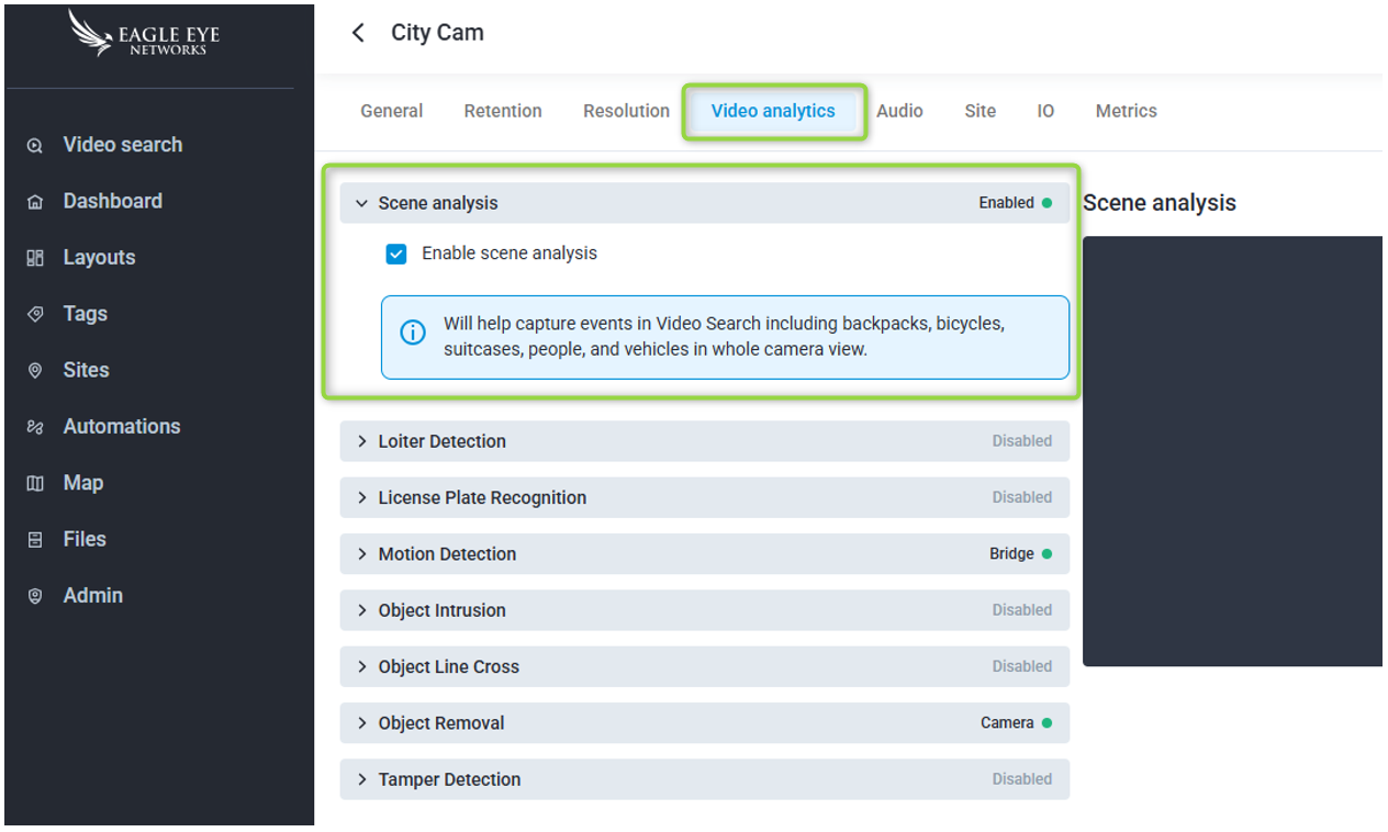 To utilize Bosch camera-generated events and metadata, enable Scene Analysis in Eagle Eye Cloud VMS: