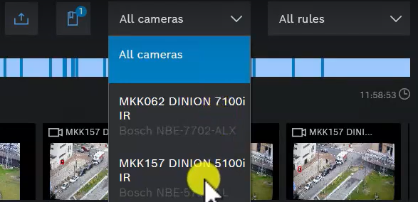 13. Select All cameras or specific cameras to filter the results per camera or filter by tasks by using the filter All rules or specific rules selection.