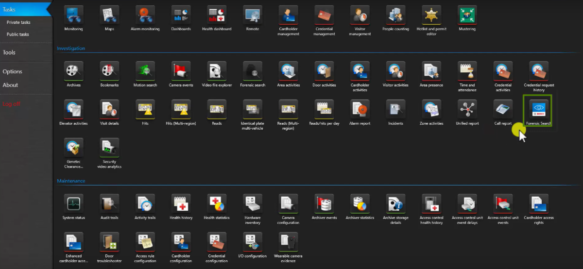 1. To access it, log in with your Genetec Server credentials and select the Forensic Search button in the Investigation section.
