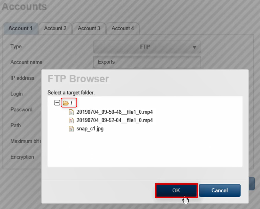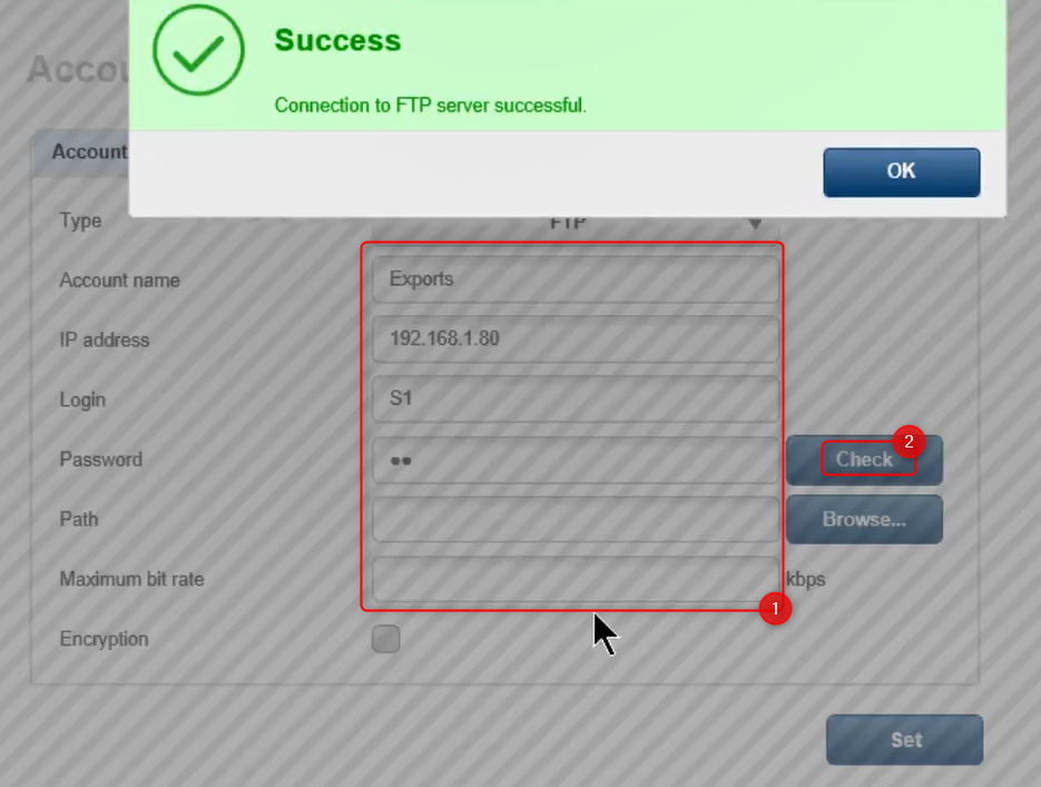 Select one account among the 4 displayed and select FTP from the drop-down list > fill in the necessary details and Check if the connection has been established by clicking on the "Check" button