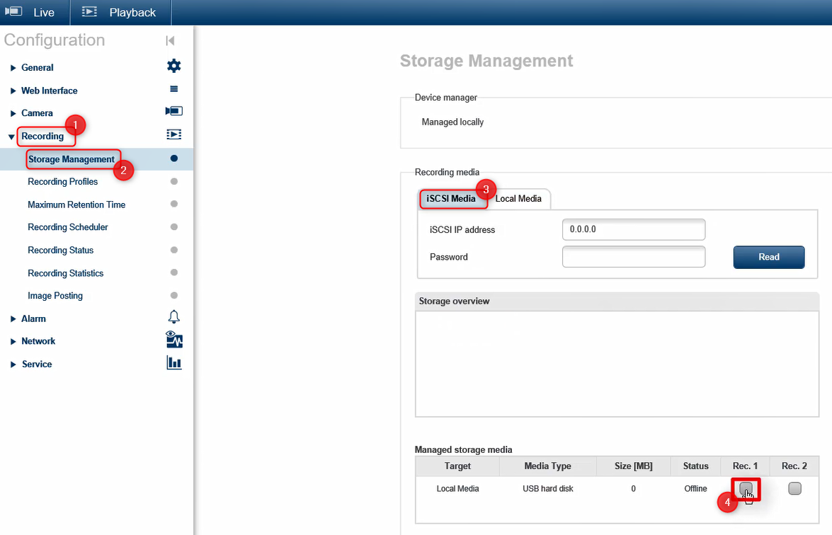 Next, go to Recording > Storage Management > select iSCS Media and tick the Rec. 1 checkbox > click Set