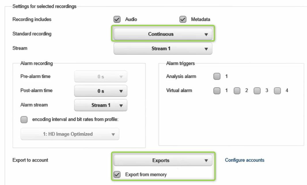 Next, go to Recording > Recording Profiles > select the Exports option from the drop-down menu, tick the "Export from memory" check box and be sure that the Standard recording is set on Continuous > click Set