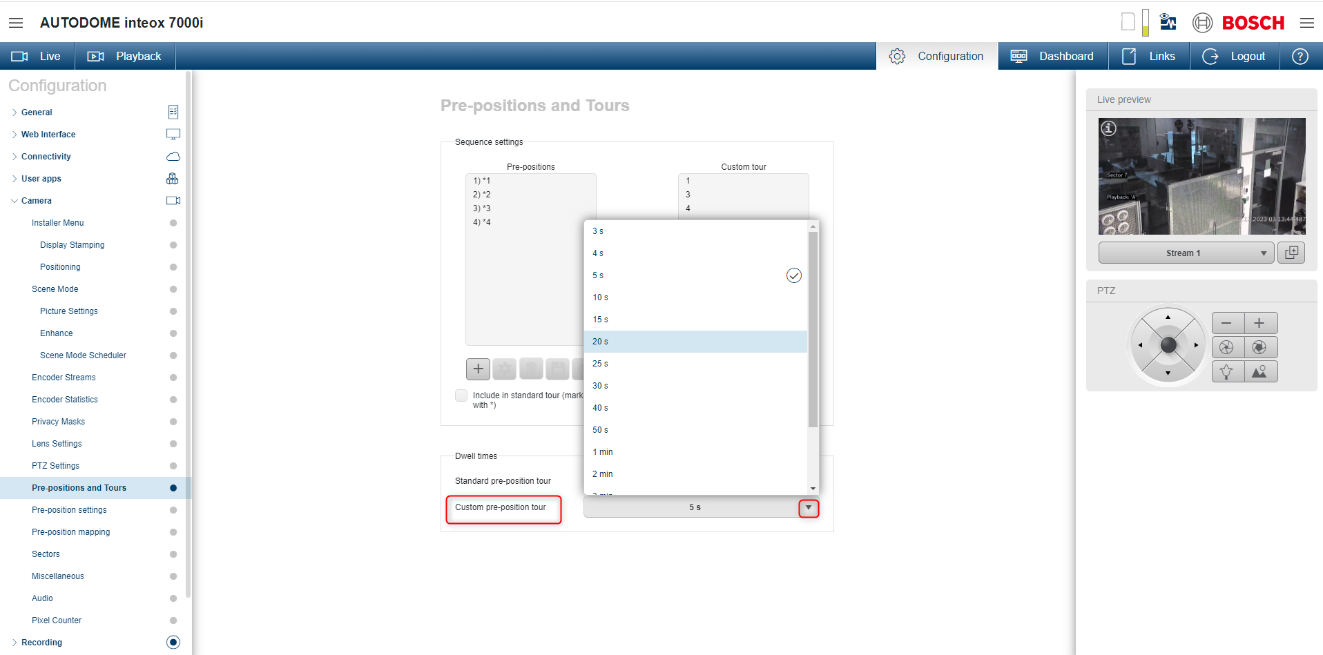 Select the dwell time in seconds or minutes for the Custom pre-position tour.