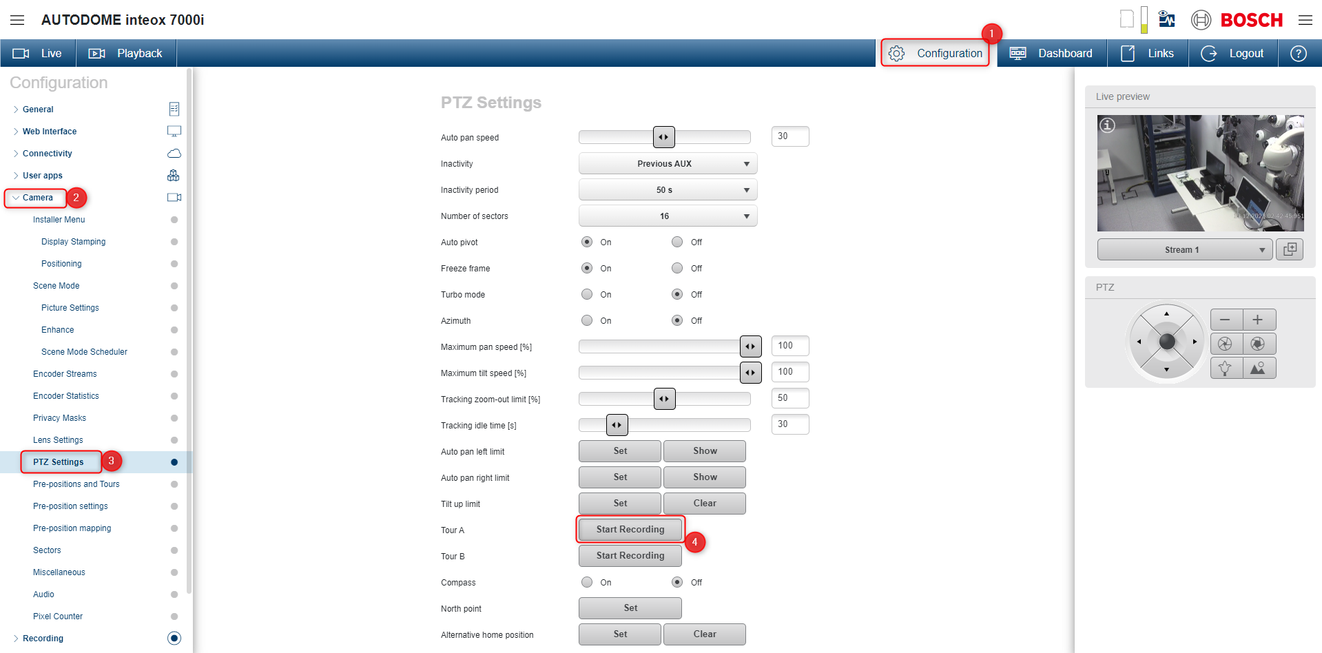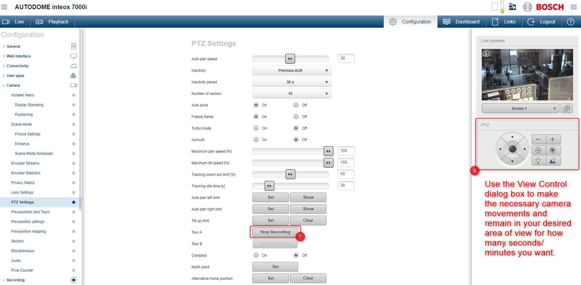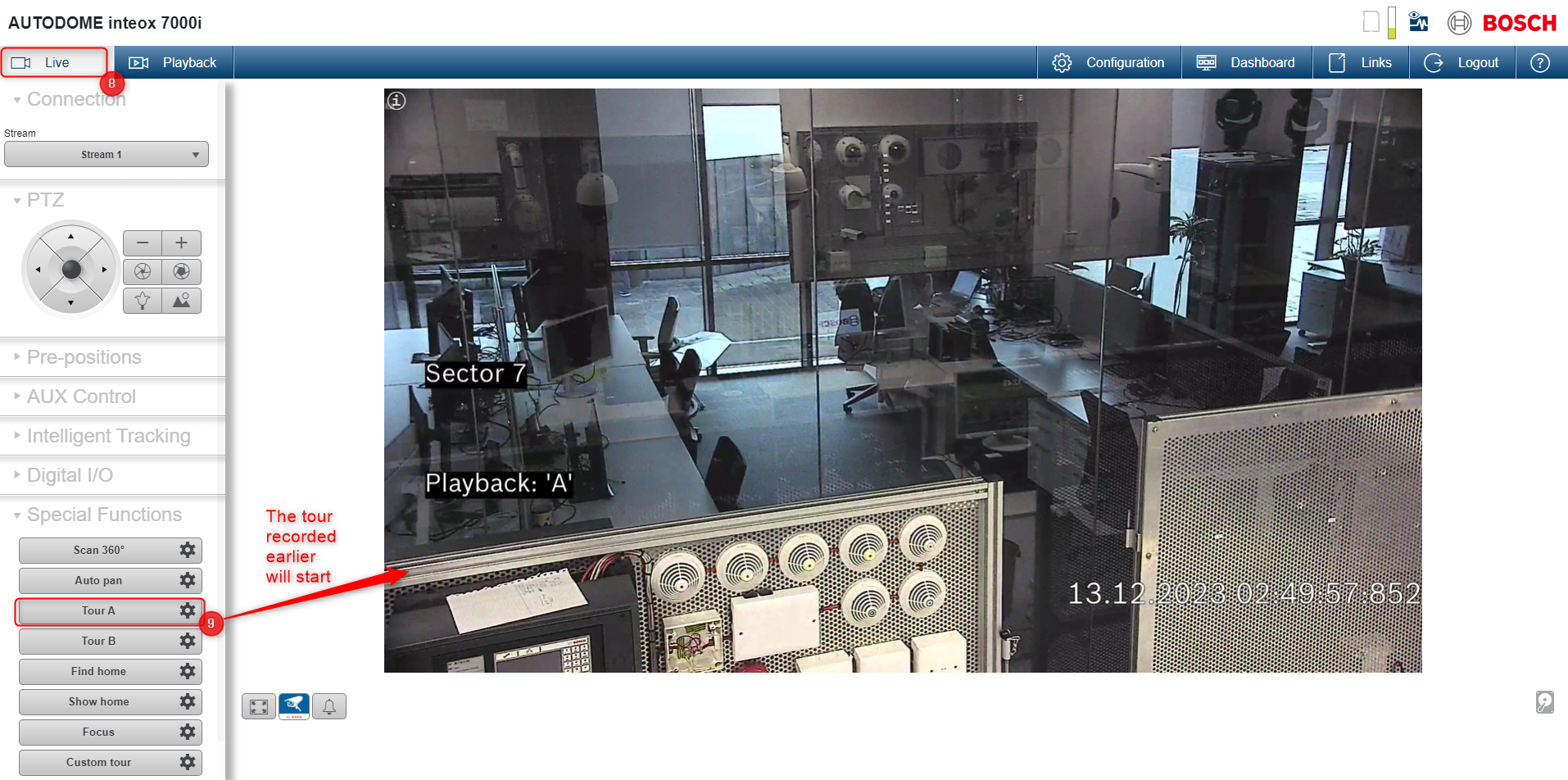 4. In the Live window, click on the Tour A from Special Functions menu and the recorded tour will start in the camera's Live view: