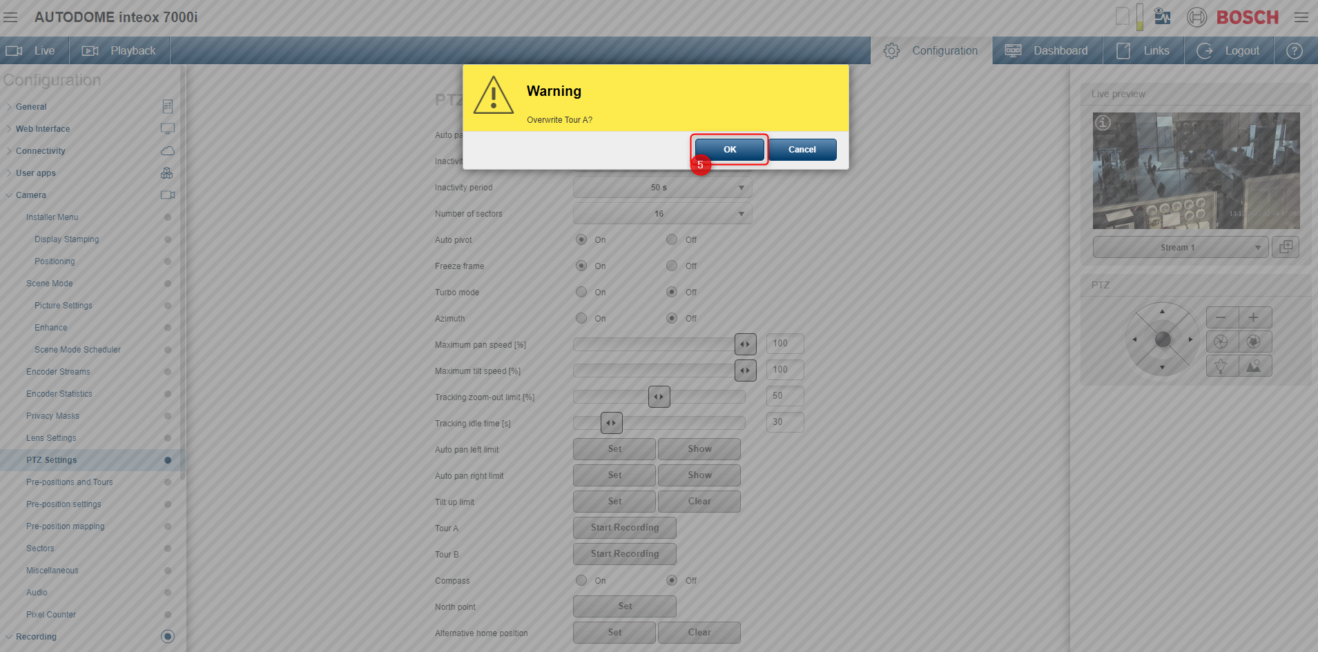 1. Go to Configuration > Camera > PTZ Settings > Click the Start Recording button next to the Tour A. The system prompts you to overwrite the existing tour.