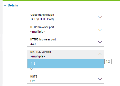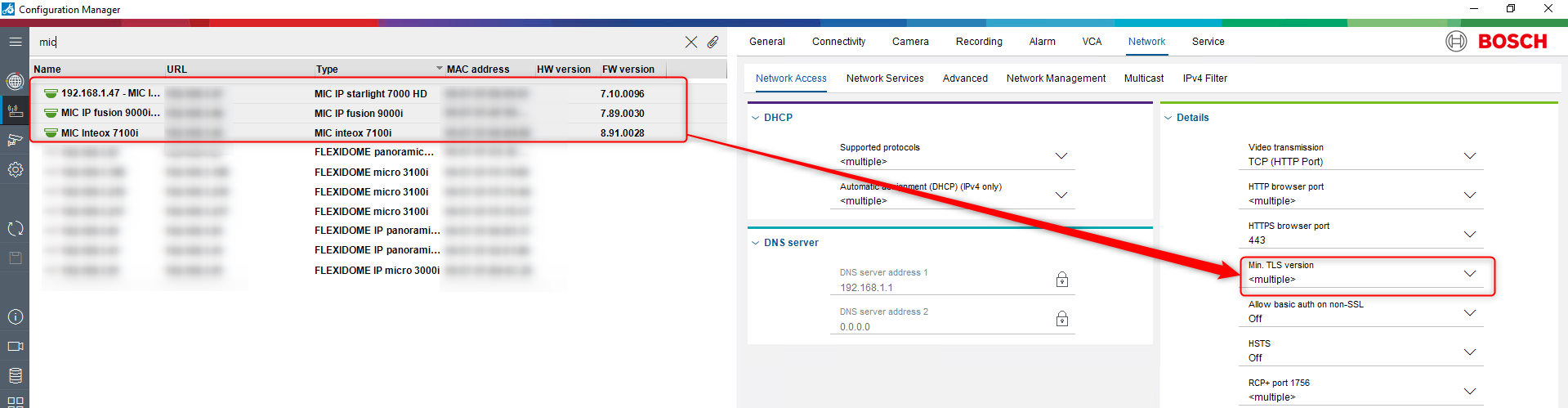 2. Once you are authenticated on the cameras you want to change the TLS for > select again those cameras if you deselected them before > go to Network > Network Access and click on the "<multiple>" drop-down list next to Min. TLS version option