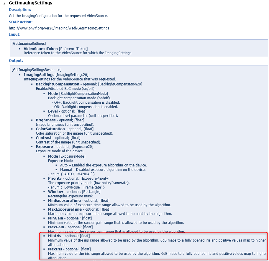 Two fields: MinIris and MaxIris are missing from the Exposure node from the GetImagingSettingsResponse SOAP document.