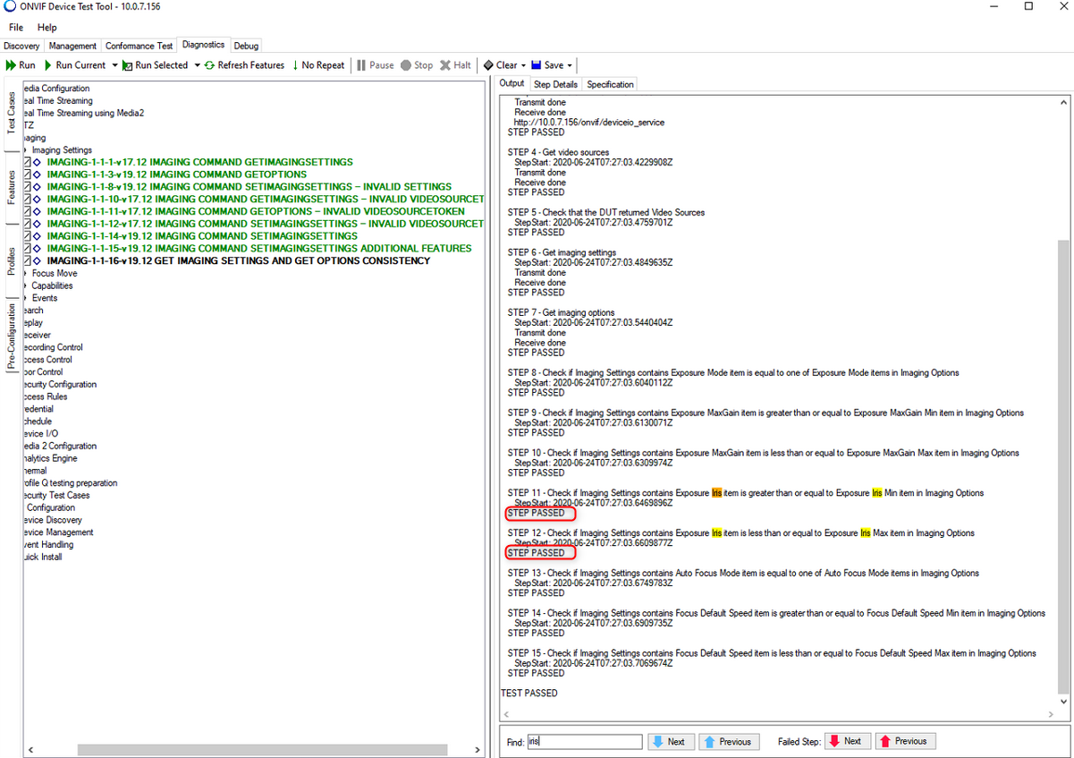 If you test this in the ONVIF Device Test Tool (tested in version 19.12 rev. 5581) you will see that the option for this camera type (MIC IP Starlight 7100i) will pass successfully, as can be seen in the following screenshots: