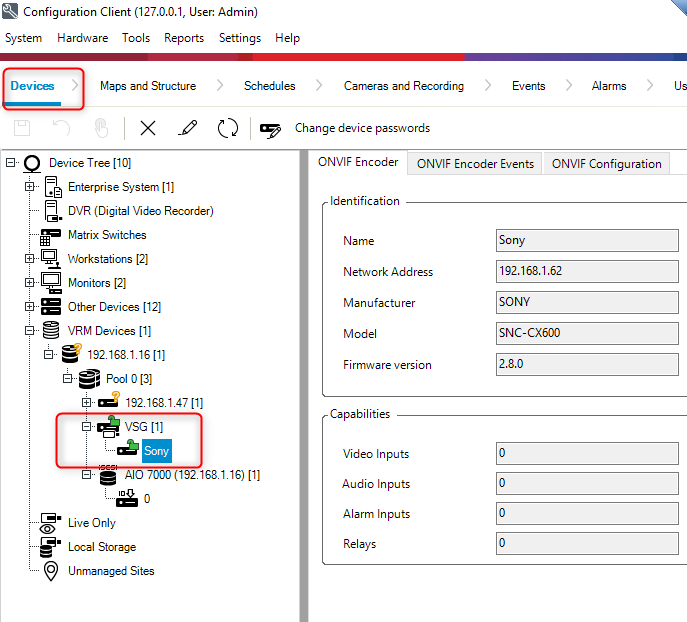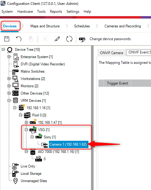 My 3rd party camera (SONY) added in VSG is not displayed in the Device Tree from BVMS Config. Client