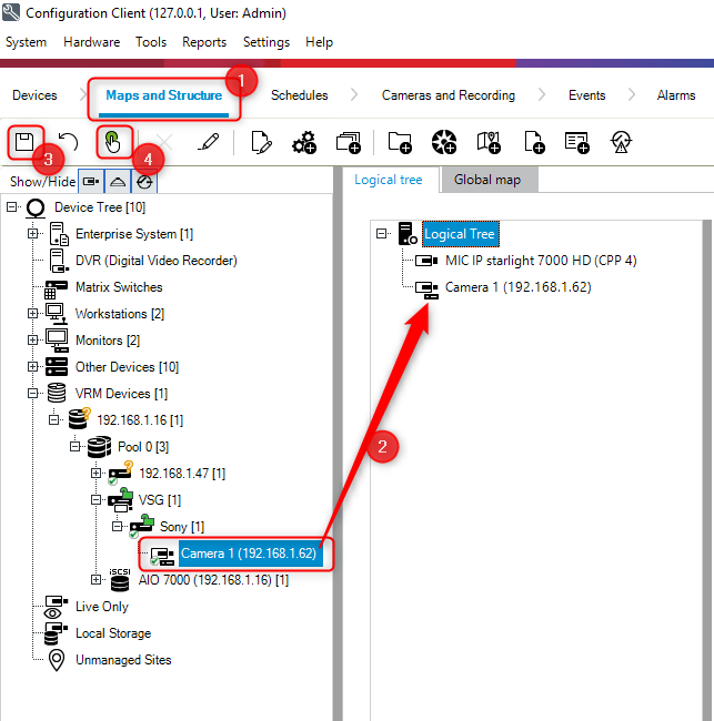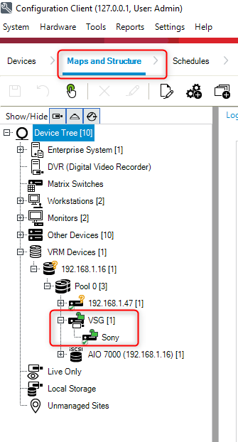 5. Next, go to the Maps and Structure menu. You will notice now that the camera is also visible in the Device Tree from this menu.