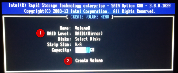 - Set RAiD level to RAiD1(Mirror), navigate to CREATE VOLUME and hit enter