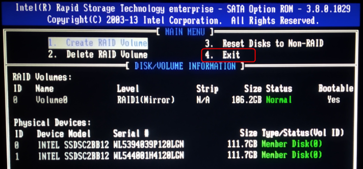 - Exit the RAiD controller, navigate to EXIT and hit enter