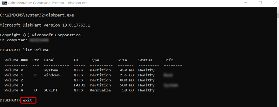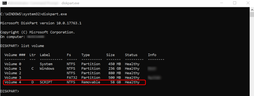 - Type into command line "list volume" hit enter and search for your USB-stick called SCRIPT, note down the assigned drive letter (LTR)