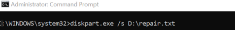 - Type into the command line "diskpart.exe /s [YOUR_USB_DRIVE_LETTER]:\repair.txt" hit enter