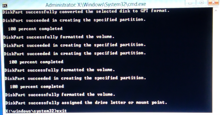 - End diskpart.exe by typing on the command line "exit" hit enter