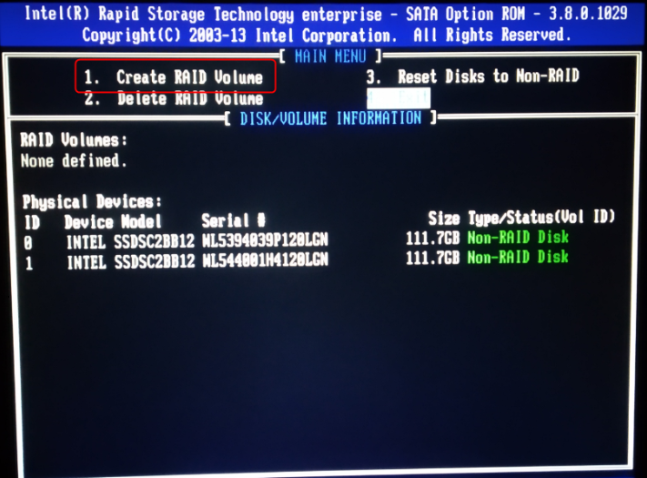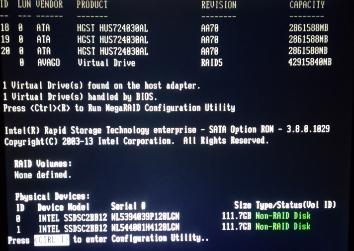 - Boot the machine and enter the Intel RAiD MENU pressing CTRL + I