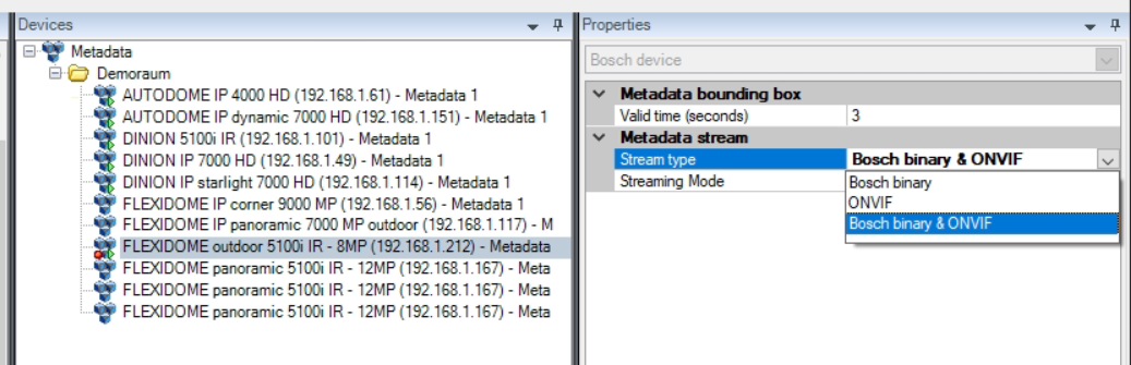 - Milestone is consuming Onvif based metadata for the Centralized Search integration and thus the Bosch Metadata Stream type setting needs to reflect this prerequisite.