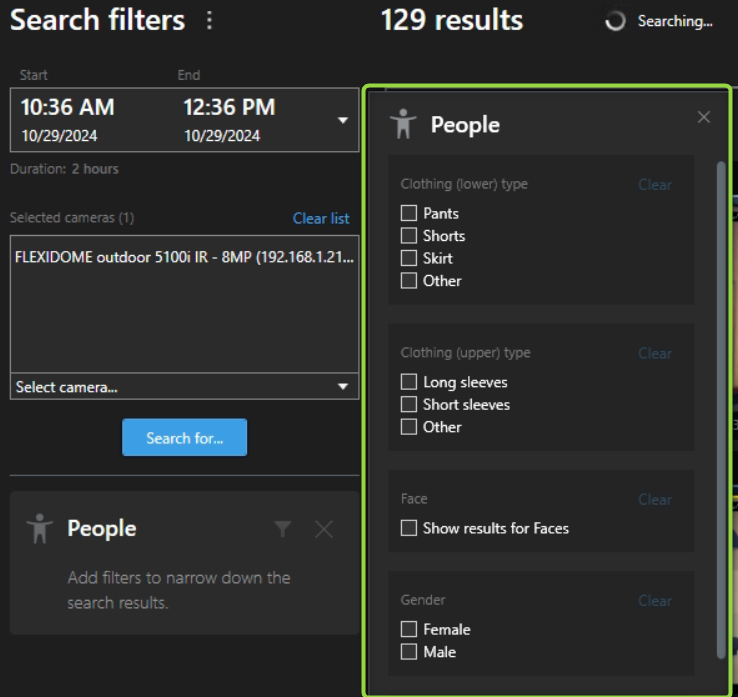- Forensic Attribute Search: Find individuals based on specific physical characteristics (e.g., clothing color or accessories) across multiple cameras.