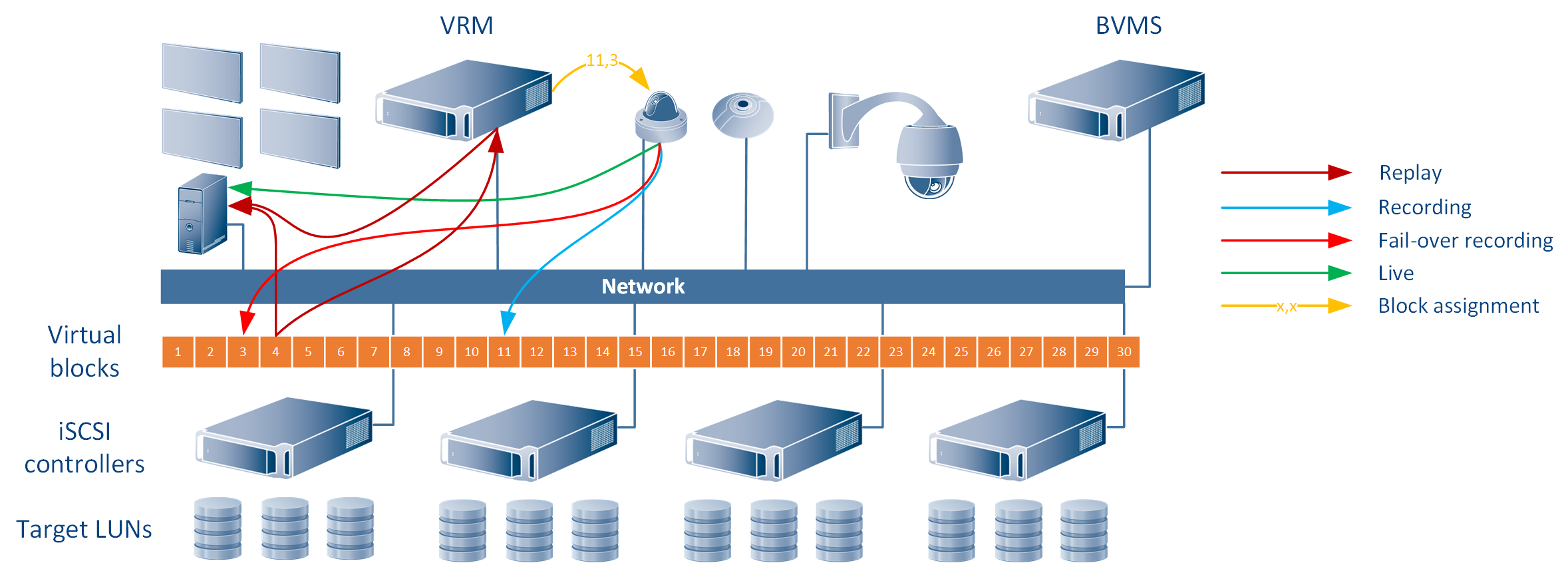 The third benefit relates to scalability: the VRM creates virtual blocks on the storage locations, which are reserved for a specific camera (depending on the configured retention time and failure options). If storage capacity is added to the system, the VRM re-calculates the available storage space and distributes the new virtual blocks to the cameras which are active in the system.