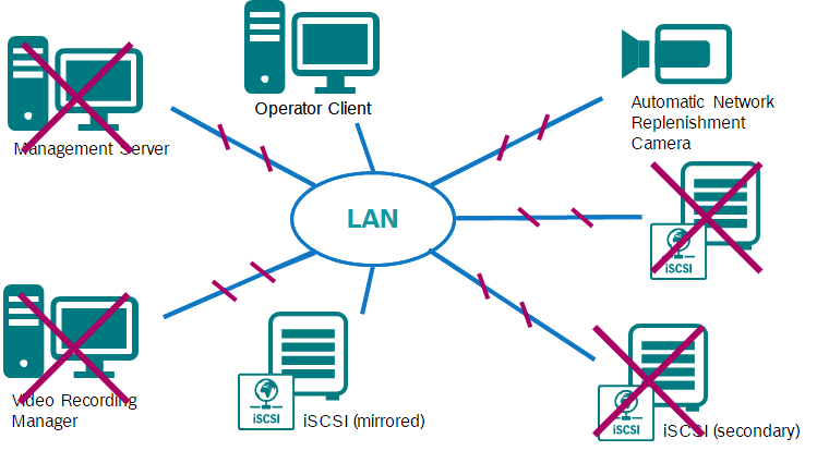 The iSCSI gateway is disconnected from the network. The camera re-connect time (time it takes before recording is restarted) will be measured.