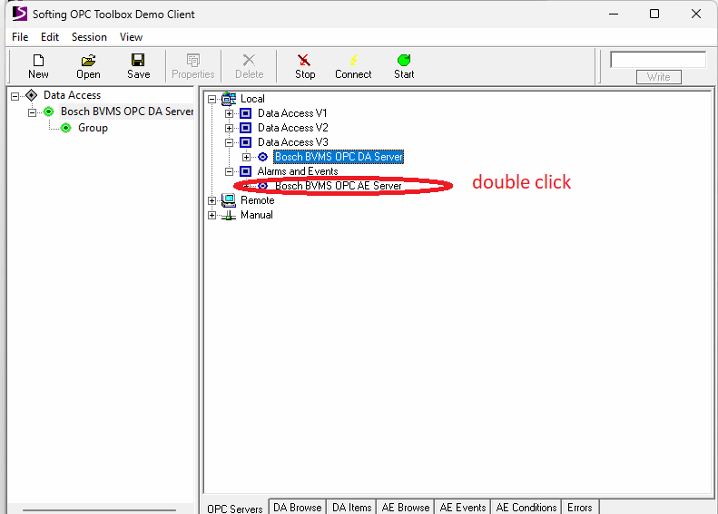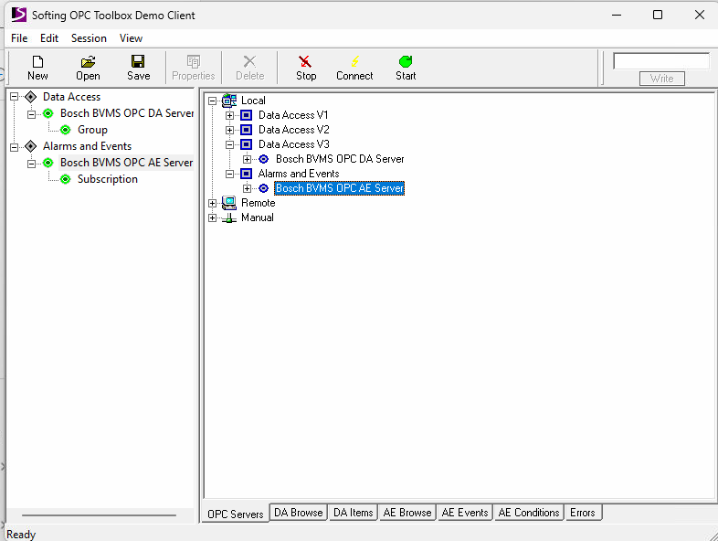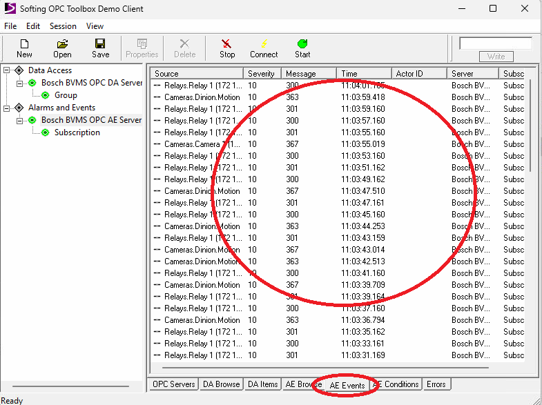 6. To see if the connection is established, check if you receive in Softing Client events from BVMS (first configure an event, for example VI, then toggle it with - C:\Program Files\Bosch\VMS\bin\VirtualInputsTest.exe and see if you receive the event in the Softing Client)