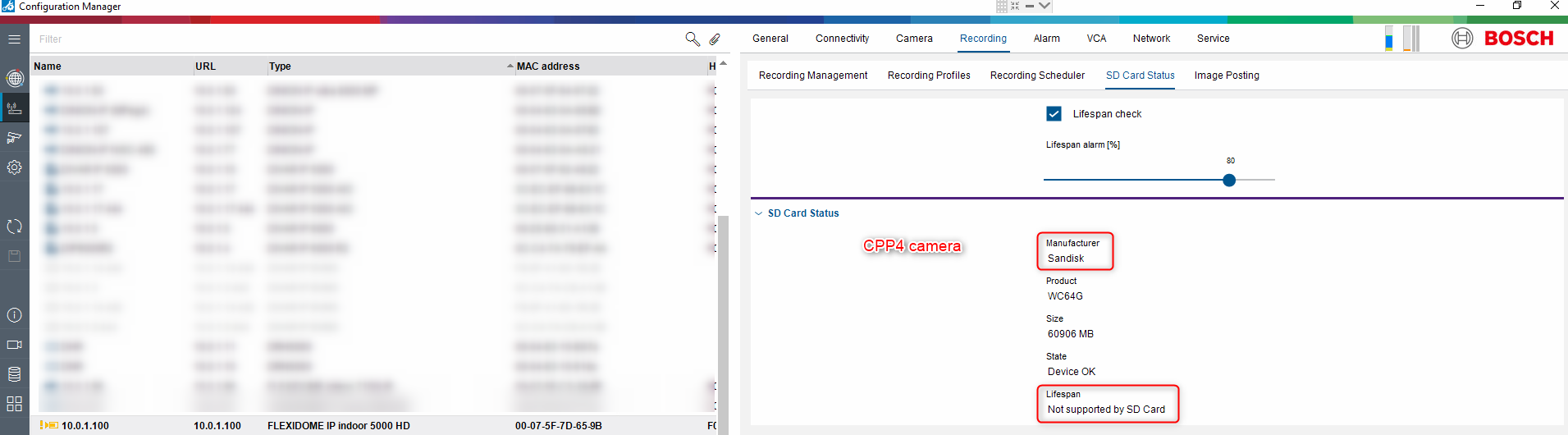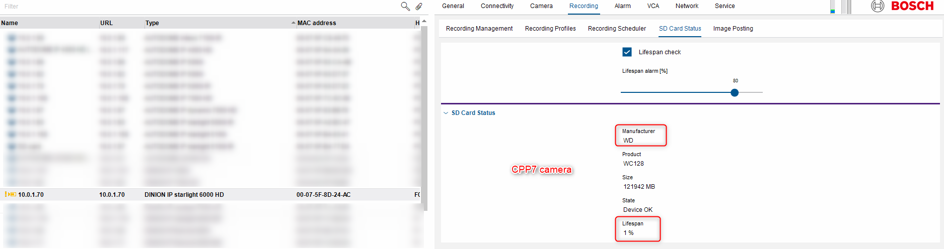 WD MSD-064G IP SECURITY MICROSD CARD does not support lifespan check for Bosch CPP4 cameras