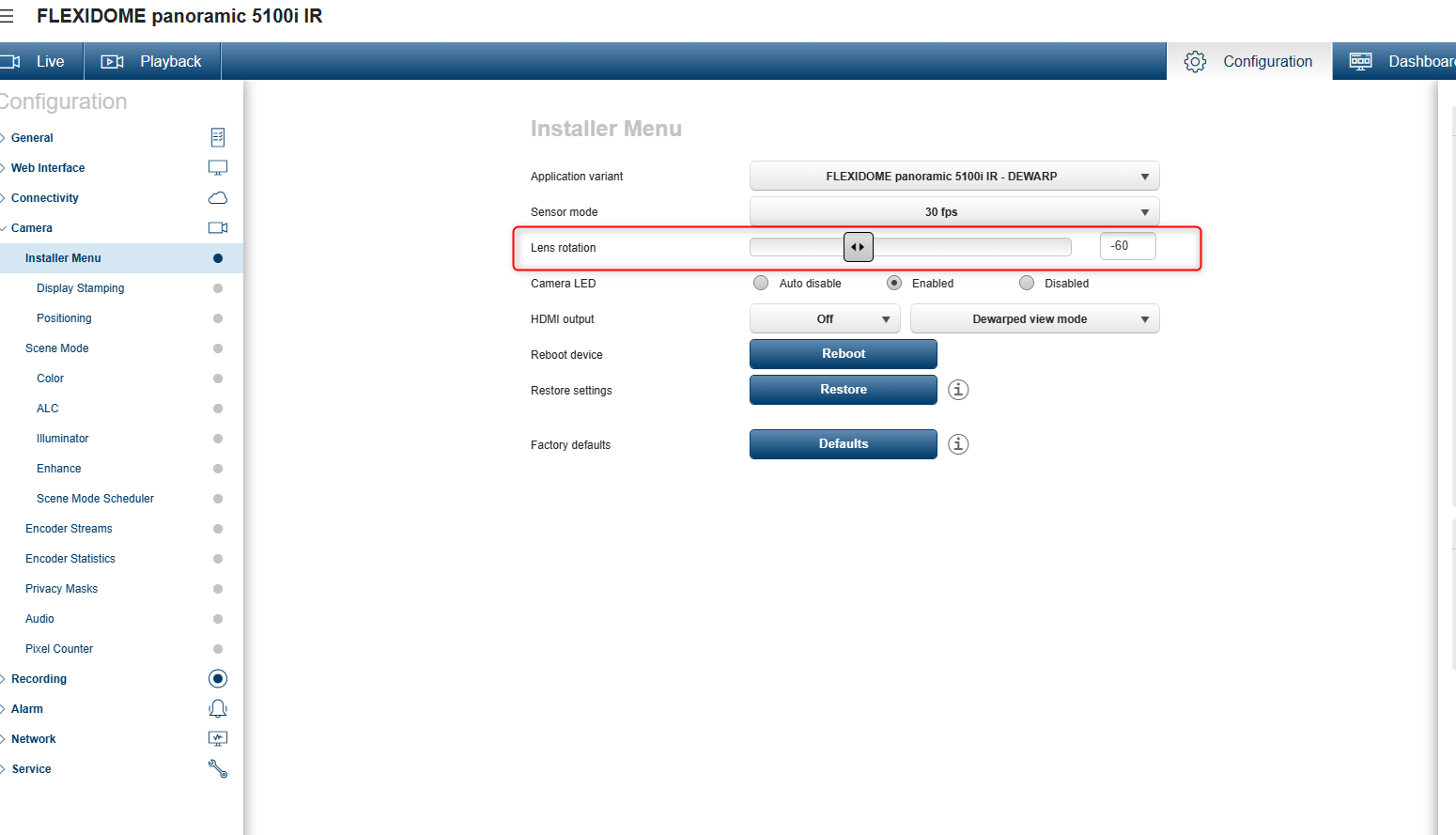The "Lens rotation" slider can be used to correct for any manual lens rotations performed during installation. If the lens is manually rotated during installation, the slider value should be aligned with the rotation value shown on the lens.