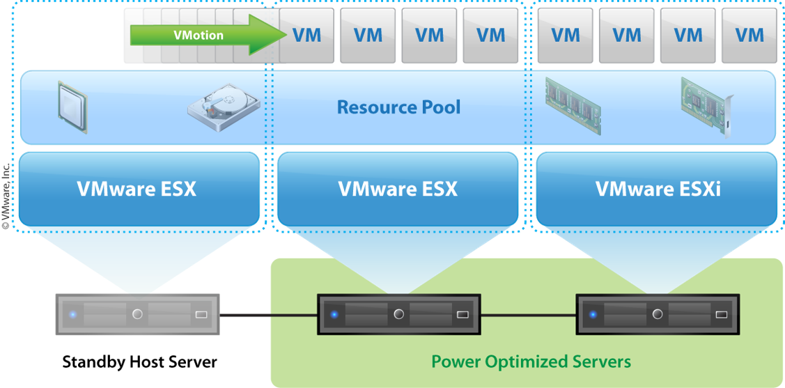 During off-peak hours the resource consumption of the environment could, depending on the applications, go down. As a result, the entire environment will have an overcapacity of computing resources. To mitigate this overcapacity the management layer is able to re-order the virtual machines on the physical servers and shut-down physical servers which are not needed any more. Once the computing resource consumption slowly starts to increase, the physical servers are powered up again and added to the pool of resources. This is especially useful in bigger environments, which have predictable peaks in resource consumption.