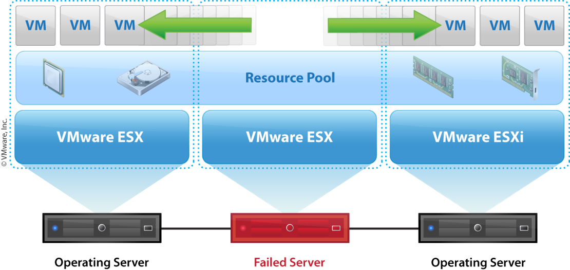 Let's assume one physical server is running 3 virtual servers. Both the physical server and virtual servers send a "heartbeat" (monitoring signal) to the management service. The environment is built with the assumption one physical server can fail, and has the available computing resources to catch such a failure. When the physical server fails, the heart beat of the physical server as well as the virtual machines is not received by the management service any more. The management services immediately reacts and boots up three new instances of the virtual machines and spreads these virtual machines over other physical servers, depending on the available capacity. The downtime of the virtual machines is mostly limited to a minute or two, depending on the time it takes to start the operating system and the services running on top of the operating system.