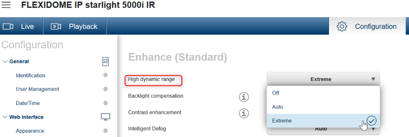 Note that the High dynamic range will not be visible in the Enhance menu if the HDR is not activated from the Installer Menu > Sensor mode