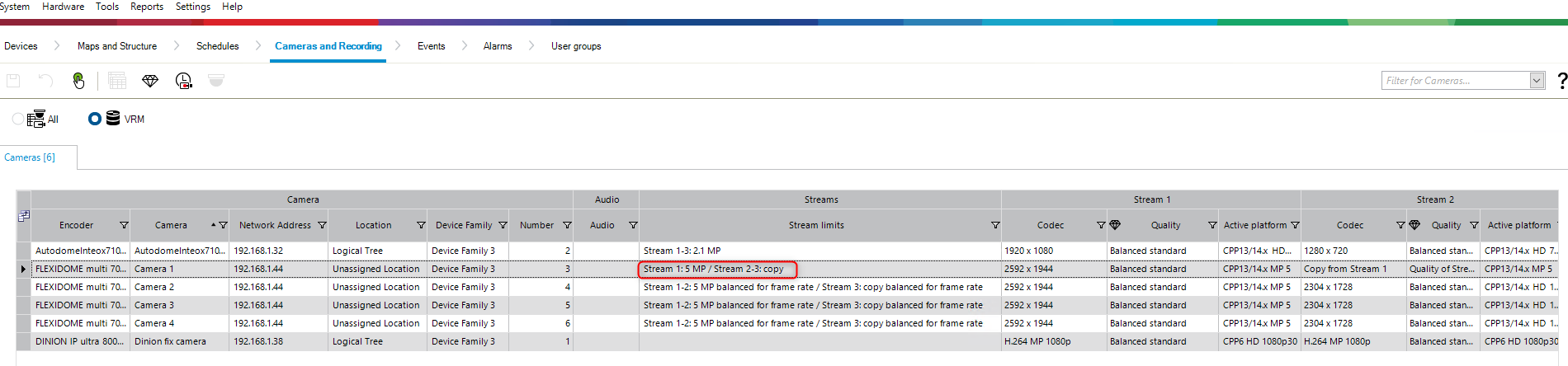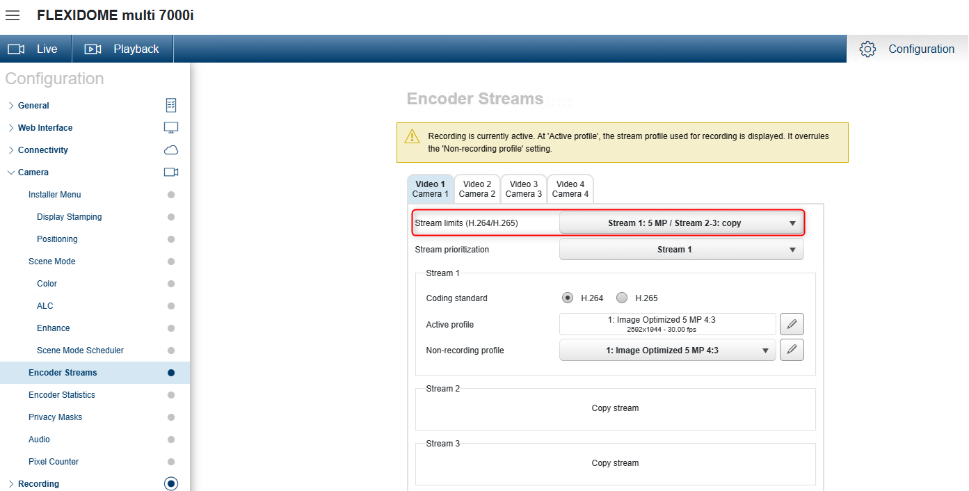 The stream limits set in the WEB page of FLEXIDOME multi 7000i camera is Stream 1: 5 MP / Stream 2-3: copy, but when accessing it in the BVMS Configuration Client, this parameter is not the same.