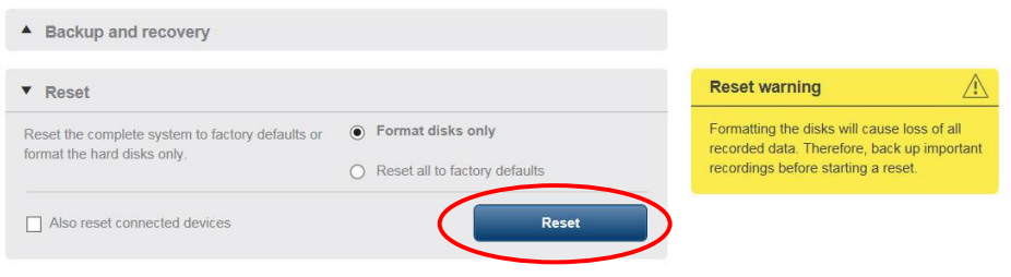 - Format disks only: This option will only format the video disks of the appliance. Selecting this option leaves the appliances database and video devices untouched