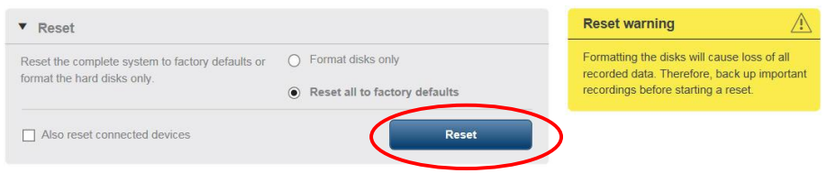 Selecting the "Also reset connected devices" will default all video devices associated with the appliance back to their factory default state, to include: