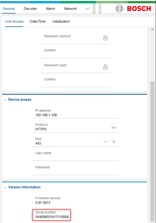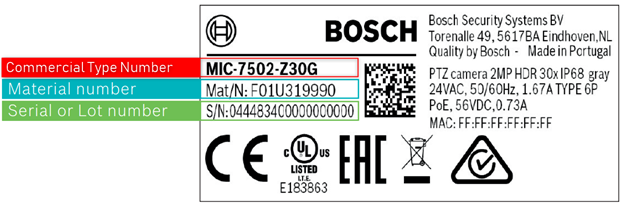 Each Bosch device has a label on the back of its housing. In the following picture is an example of the label which contains the information you are looking for: