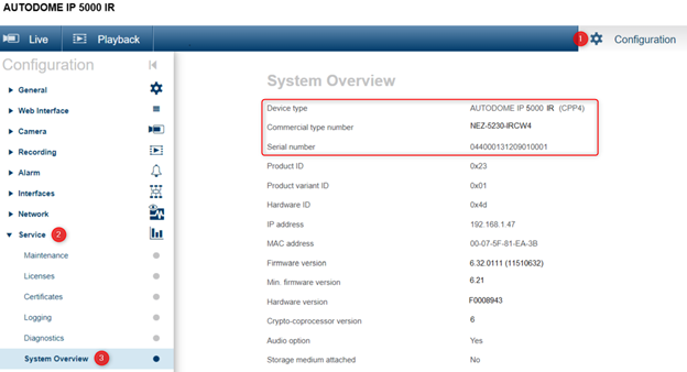 For example, if you have an IP camera, type its IP address in the web browser and go to Configuration > Service > System Overview.
