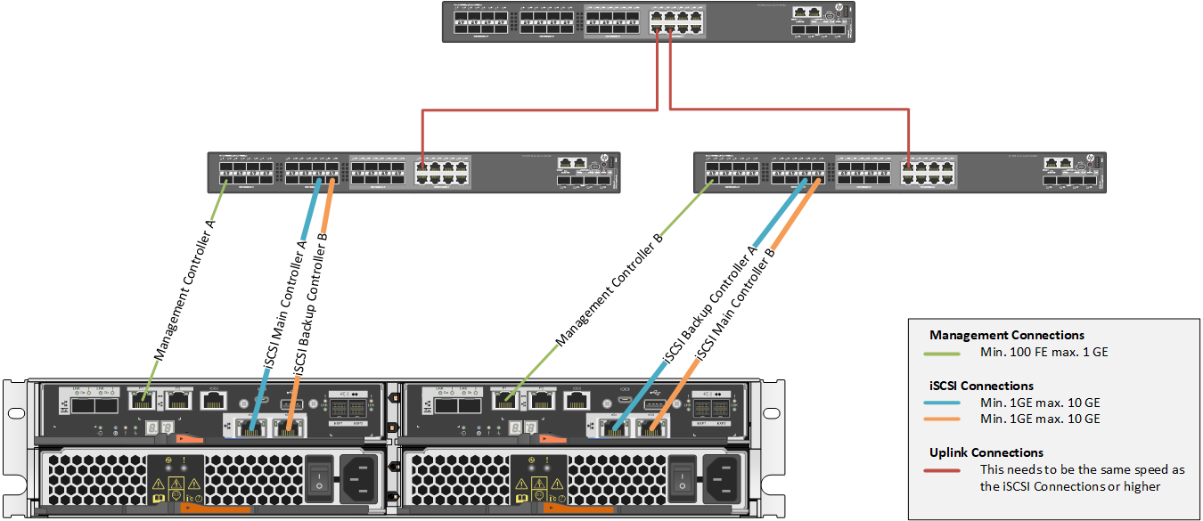With the DSA E2800 Bosch introduced Multipathing. It is a fault-tolerance technique that defines more than one physical path between the camera and its iSCSI storage devices through redundant network connections. When using this feature, recording of video data and replaying video data is possible even in case of an iSCSI controller failure. To ensure also that outages of infrastructure equipment (e.g. Switch) could be covered, we recommend following Interconnection.