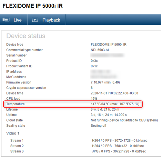 The Dashboard of Bosch cameras shows a lot of data points and general information about them, including details about their temperature as well.