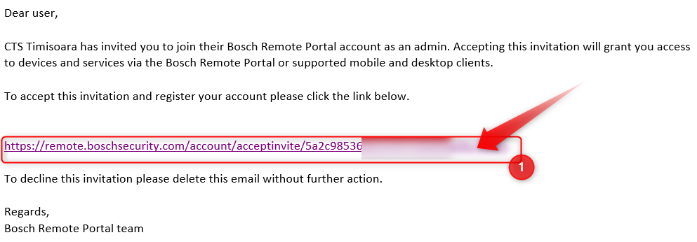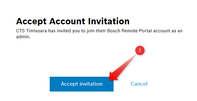 After receiving the new Bosch Remote Portal Account Invitation email, please be sure that you click on the “Accept invitation” button from the browser, after clicking the link inside the email. Clicking only on the link inside the email it is not enough. So, it is required to submit the “Accept invitation” button for the process to be complete and for you to be able to see the company in your account, under the User Settings > My companies. Also, by accepting the invitation, you will be able to see the cameras in the VSC, their live image and recordings, also editing them in the Configuration Manager and so on.